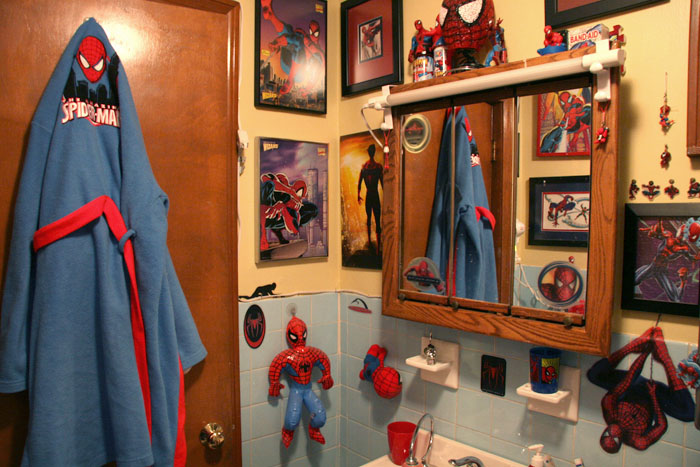 Wow. I’ve only seen one other bathroom that’s this decked-out with a similar theme, though that was a girl’s bathroom and the motif was rubber duckies. Question though: Do ya have a spider-man shower curtain, too? What about Spider-Man toilet paper?