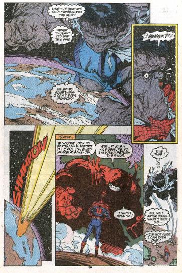 This issue was an interesting situation of the tables being turned. The Hulk, at this stage, had regressed to his gray personna which was smarter but nonetheless weaker than the Big Green. And Spider-Man, who had always been at a disadvantage against such heavy hitters, had been chosen by fate to temporarily possess the powers of Captain Universe. I think there was a line after he knocked the Hulk into space – either he said it or the kid beside him said it – was “I dont think he’s coming back down.” I loved how Todd drew the Hulk’s face as Spidey grabbed him and dragged him back down to Earth. WTF?!
