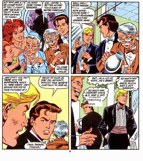 Because you demanded it! Because some of you even begged me for it. Heck, one person recently shook me down for it! I give you more “Spidey Revisions”. Peter and Johnny go to an art show for Alicia Masters Storm in “Web Of Spider-Man #73”, but Peter realizes that sharing keys with Mary Jane has made him a new more mature man. Neither of this men are married any longer. One involved a retcon which de-aged the husband character and caused his marriage to seldomly be mentioned ever again, and the other was “One More Day”. If you can’t read the text, click on the picture.
