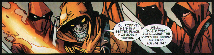 Phil/Hobgoblin is written to be very shrill and annoying. I get that Slott wants to call back to the early, giant-ears-and-broomstick days of the Green Goblin with his portrayal of Hobgoblin, but it comes across as forced wackiness. That’s a persistent problem when he’s such a large part of the story, both as the main villain and with an additional civilian subplot. He also creates a black hole of logic in the story, forcing other characters to act in ways that defy reason. For example, Ben Urich sees his nephew at The Daily Bugle and makes note of his suit, and Phil makes a vague statement about his well-paying job. However, Ben never asks him what that job is, nor does he even seem concerned that Phil has suddenly become a big spender. I don’t know about you guys, but if I started walking around in fancy suits and talking about how much money I was making, everybody I know would be up my ass 24/7 about it until I filled them in on all the details.