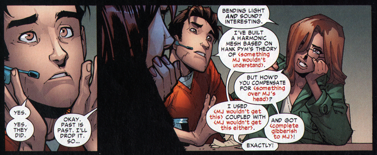 I didn’t take the scene as Peter and Carlie deliberatly mocking MJ. I thought the stuff in the red was just metatext. It happened during the recent clone saga arc with the raptor when Ben visited his boss’s house for dinner. I think it’s a short hand tool the writers use to get out of having to write boring science talk, they neither they nor use would understand.