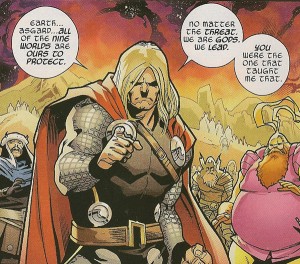 What to Cheer: The creative team behind the art continues to create some of the best work I have seen in comics recently. The coloring is rich, the characters are all exactly how I picture them in my mind and the thick black outline continues to accent the panels and helps make the art pop off the page. The inking is really well done as evidenced by the outlines, as well as when it’s used to add depth and shading, or to add extra details to the scenes such as the wrinkles in Odin’s face or the armor worn by Thor and his father.