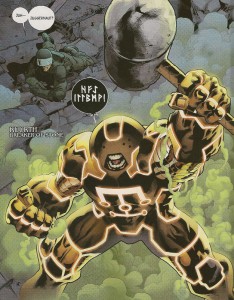 Why do all the weapons have to be hammers anyway? Is it just because Thor has a hammer? It doesn’t bother me that much, but I’d like to see a little more variety in the chosen characters. Hopefully the hammer falling on Yancy Street doesn’t mean the Thing will be next to take up a weapon. As far as their transformations go, why do all the Norse markings make the characters look like they belong in the movie Tron? When Thor came into possession of Mjolnir he didn’t resemble a bright neon sign.