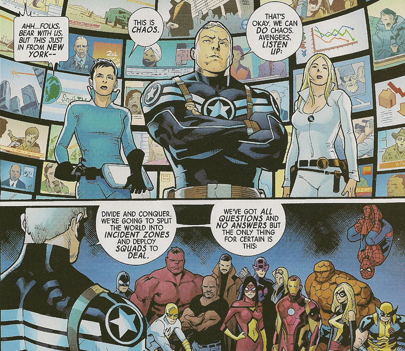 Steve Rogers is monitoring news reports from all around the world. He speaks to the gathered Avengers on how to combat the chaos. Rogers deploys squads around the globe to keep the peace. Reed Richards, leader of the Future Foundation, contacts Rogers and reports that he is on the scene of the impact of one of the other hammers. Richards lets Rogers know he is sending his initial analysis to him for review, and that he should let the Thing know that it landed close to Yancy Street, his personal stomping ground.