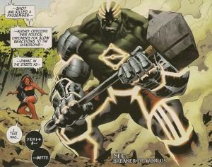 The next hammer rockets through the sky in Brazil. Bruce Banner and Betty Ross are camping in the wilderness and discussing their failed marriage as well as Betty’s new ability to transform into the Red She-Hulk. When they spot the falling object, the couple transform into their alter-egos and give chase. The Hulks come across the hammer lying in a crater, and it calls out to Hulk. Betty warns Hulk not to touch it, but he does anyway and is transformed into Nul, Breaker of Worlds. Bruce fights the possession just long enough to tell Betty to run, and she does.