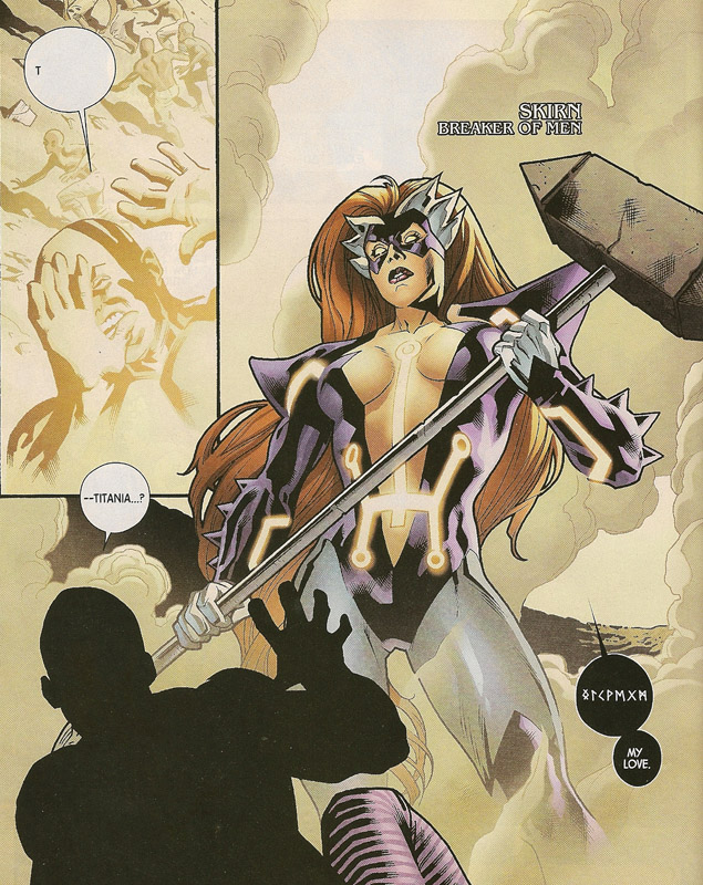 In a diamond mine in South Africa, Absorbing Man is struggling with lifting another hammer that fell from space. Absorbing Man can’t budge the object, but his wife, Titania, hears the hammer calling to her and is able to lift it. She is transformed into Skirn, the Breaker of Men. Titania remains present in the possessed body and informs Absorbing Man that they are to head North, where he will find his own hammer. She is interrupted when the Serpent reaches out to all his children and speaks to them.