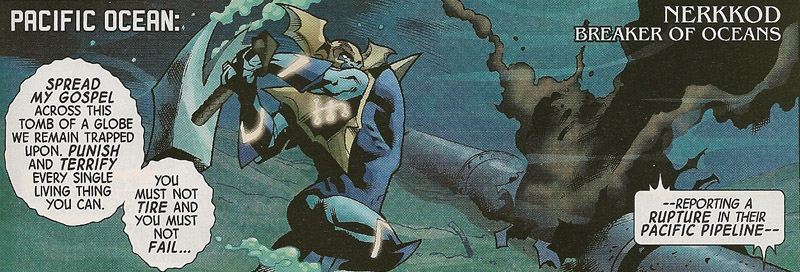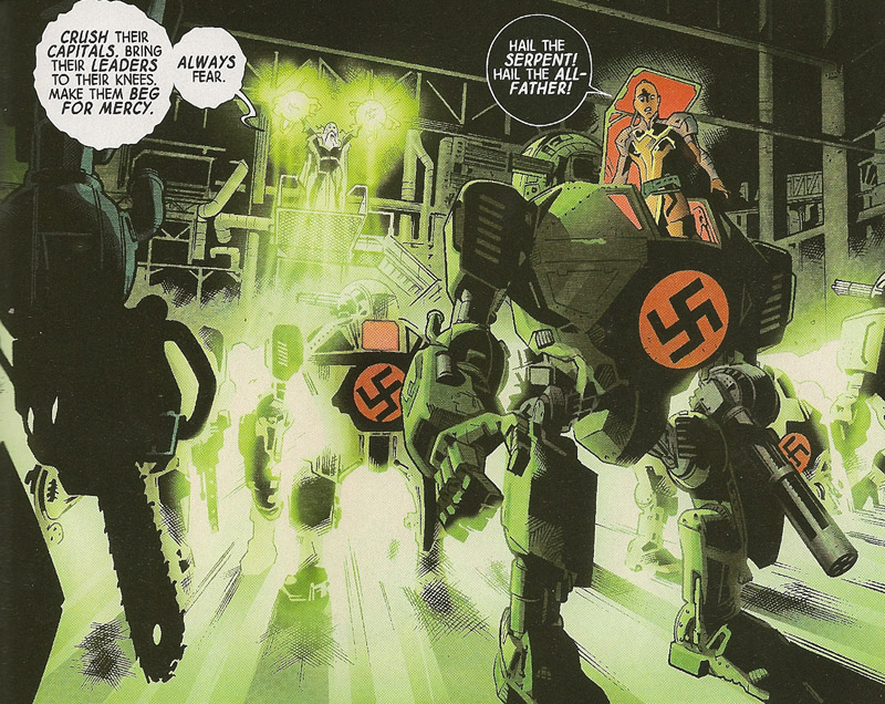 The Serpent, in his Nazi-hideout with Skadi, tells his minions to go forth and bring terror to the world. He tells them to “punish and terrify every single living thing.” Skadi speaks to soldiers in the base while her father sends out his message of hate and fear. Another chosen one, Nerkkod the Breaker of Oceans, is seen destroying an underwater oil pipeline, polluting the waters. Skadi enters into a large war machine with the Nazi symbol on its chest, and leads the soldiers into war according to her All-Father’s bidding.