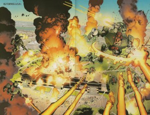 The real world parallels are still present, but they are not as obnoxious as the last issue. I wanted to make a joke in the last review about how I wouldn’t be surprised if they made a reference to oil spills and sure enough here it is in this issue. Blowing up the Capitol building was a cool splash page, but the impact of it was kind of ruined with the promotional teaser images. I’m also not sure if this is the most appropriate image to put out there with the current events in real life, especially when every other event seems to be based on real-world happenings.