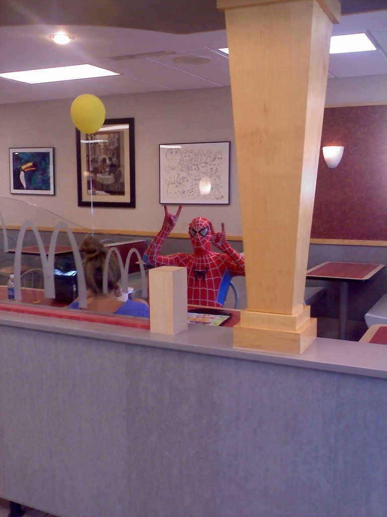 Our good buddy Gregxb from the message board sent me this picture. He stopped in to grab some McDonalds and spotted Spidey there grabbing a burger. So feel free to add a funny caption to this picture in the comment section.