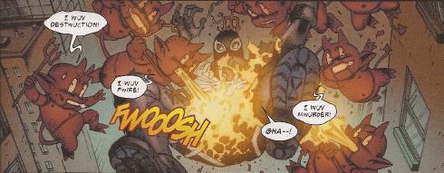 What else . . . ah! I have to comment on what a quirky spectacle this series is. Remender has one of the most refreshingly bizarre senses of humor in comics, and Tony Moore is the perfect person to bring Remender’s vision alive. Any issue that shows Venom swallowing an entire shelf of Ambien (or something like that) and then getting attacked by fire-breathing baby devils that “wuv destwuction” while their pumpkin-headed master sings “Free Bird” is a winner in my book. In fact, I really love—no, wuv—this whole take on the Jack O’ Lantern. The other characters to don the identity have never impressed me, but the joy this version takes in his malevolence is infectious. This book has been almost nothing but action scene after action scene since day one and this sort of weirdness goes a long way toward keeping the book from becoming generic or repetitive.