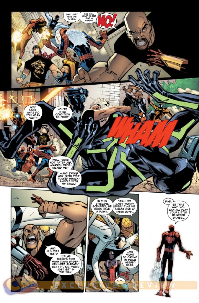 Starting at the top, the whole business of Peter being benched by the other super heroes smack of being convinent for the plot. I can understand the Marvel Heroes being pressured by the sheer number of Spider-powered people, but to not include the original in the fight against them just doesn’t make any sense. To address Luke Cage’s point about Spidey being “in no condition to fight”, (despite the fact that he wasn’t even looking at him and Spidey seemed fine to me) Peter has a heightend recovery rate. He wasn’t hit that badly, and his experience alone gives him the edge over fighting people with powers similar to his. Heck, he fought Venom and Carnage alone several times and both of those characters were many times his strength and he still managed to get the better of them. Granted through different means, but also look at his fights with Ben Reilly. Peter’s been in this situation before, and has the best experience with this situation. Also, how many times has he fought alongside the Avengers and the FF? Don’t they have drills for this sort of scenario where one of them takes a beating? Finally, I didn’t buy him getting confused for the fake Spideys in the last issue and I don’t buy it now. He can just stick to Shang Chi or Wolverine. There are a number of reasons why him leaving the fight isn’t the best solution and the scene comes off as being made just so we can have another sad sack instance of Peter Parker being a loser. It’s ridiculous.