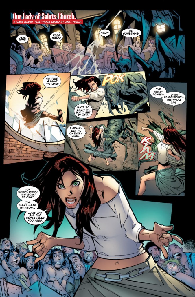 The scene itself I disliked, mainly because Mary Jane is talking aloud to herself and no one else while she’s battling monsters. It really is ridiculous, and I for the life of me can’t figure out why Slott prefers to write this way. Narration captions are so much more personal and convey the person’s inner thought more seriously than speaking out loud to no one but themselves. Speaking out loud to one’s self is only good for Shakespearian style soliloquies, and since Mary Jane isn’t Lady Macbeth, it doesn’t work. The content of her speech is really annoying and doesn’t ring true either. “Hate to admit it but I get it now. I really get it.” It’s going off the idea of OMIT where she told Peter she couldn’t take the danger of being with him, but it flies in the face of every time she dealt with it before, as OMIT did as well. I understand the rushes of adrenaline she has to be feeling, so the general idea of that line makes sense. For her to say “Hate to admit it” just makes her sound petty, as though she had to put up with Peter’s sense of altruism for all those years and never had a clue before about why he remained Spider-Man. Especially when you factor in the fact that Peter’s sense of responsibility if what attracts Mary Jane to him, this scene renders itself mis-characterized for MJ.