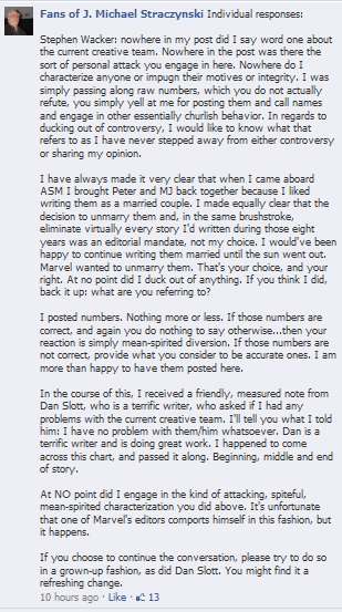 Wacker should have kept his mouth shut, or at least contacted JMS in private if he really had to say something. That’s what Dan Slott did.