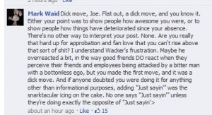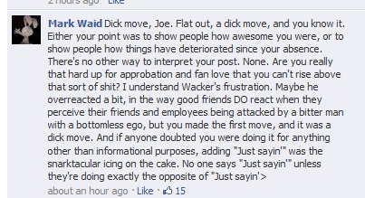 Dick move, Joe. Flat out, a dick move, and you know it. Either your point was to show people how awesome you were, or to show people how things have deteriorated since your absence. There’s no other way to interpret your post. None. Are you really that hard up for approbation and fan love that you can’t rise above that sort of shit? I understand Wacker’s frustration. Maybe he overreacted a bit, in the way good friends DO react when they perceive their friends and employees being attacked by a bitter man with a bottomless ego, but you made the first move, and it was a dick move. And if anyone doubted you were doing it for anything other than informational purposes, adding “Just sayin'” was the snarktacular icing on the cake. No one says “Just sayin'” unless they’re doing exactly the opposite of “Just sayin’>
