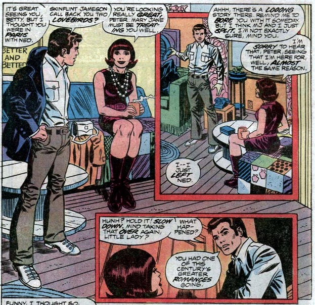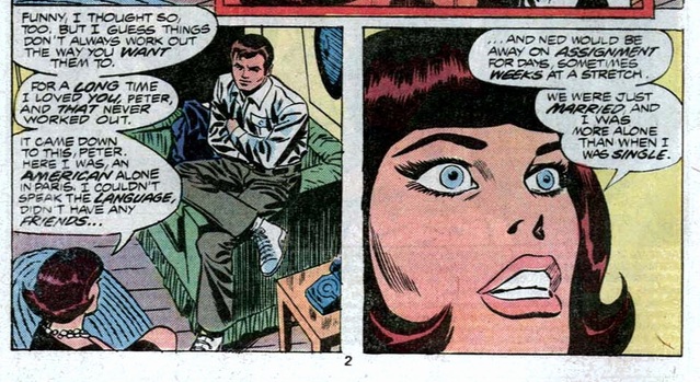 * At the end of the last issue Peter says “I never expected you of all people”. There are a few reasons why Peter is saying this. One is because when he last saw Betty, she and Ned Leeds were heading off to their “working honeymoon” in Paris. Another is because SHE DOES NOT HAVE A KEY TO HIS PLACE. Peter doesn’t expect her to be there PERIOD. Either Mrs. Muggins let her in…or worse…Betty waited until she left and then broke in.