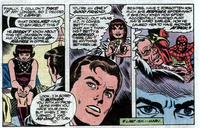 “You’re my only good friend”. It’s funny that she says that over an image of Mary Jane. MJ and Betty were good friends in Conway’s run. Heck, Mary Jane was maid of honor at the Brant/Leeds wedding…a wedding where Peter served as the best man (in case you needed another reason why this is inappropriate).