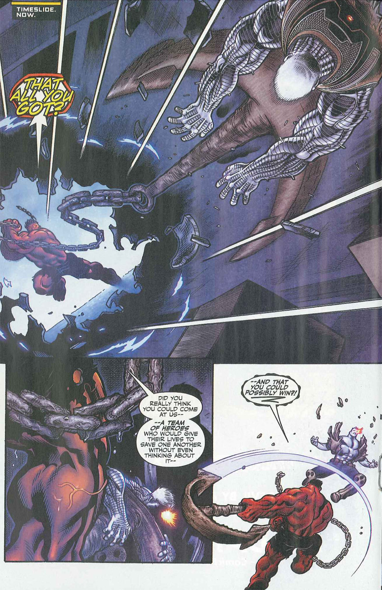 Back in the present, Rulk has recovered from Cable’s attack. He beats the mutant mercilessly with the anchor of the ship. Running out of options, Cable unleashes his hold over the Techno-Organic Virus and manages to shoot it out of his body, infecting Rulk. Cable is stopped from putting Rulk out of his misery by the arrival of Cyclops and Hope.