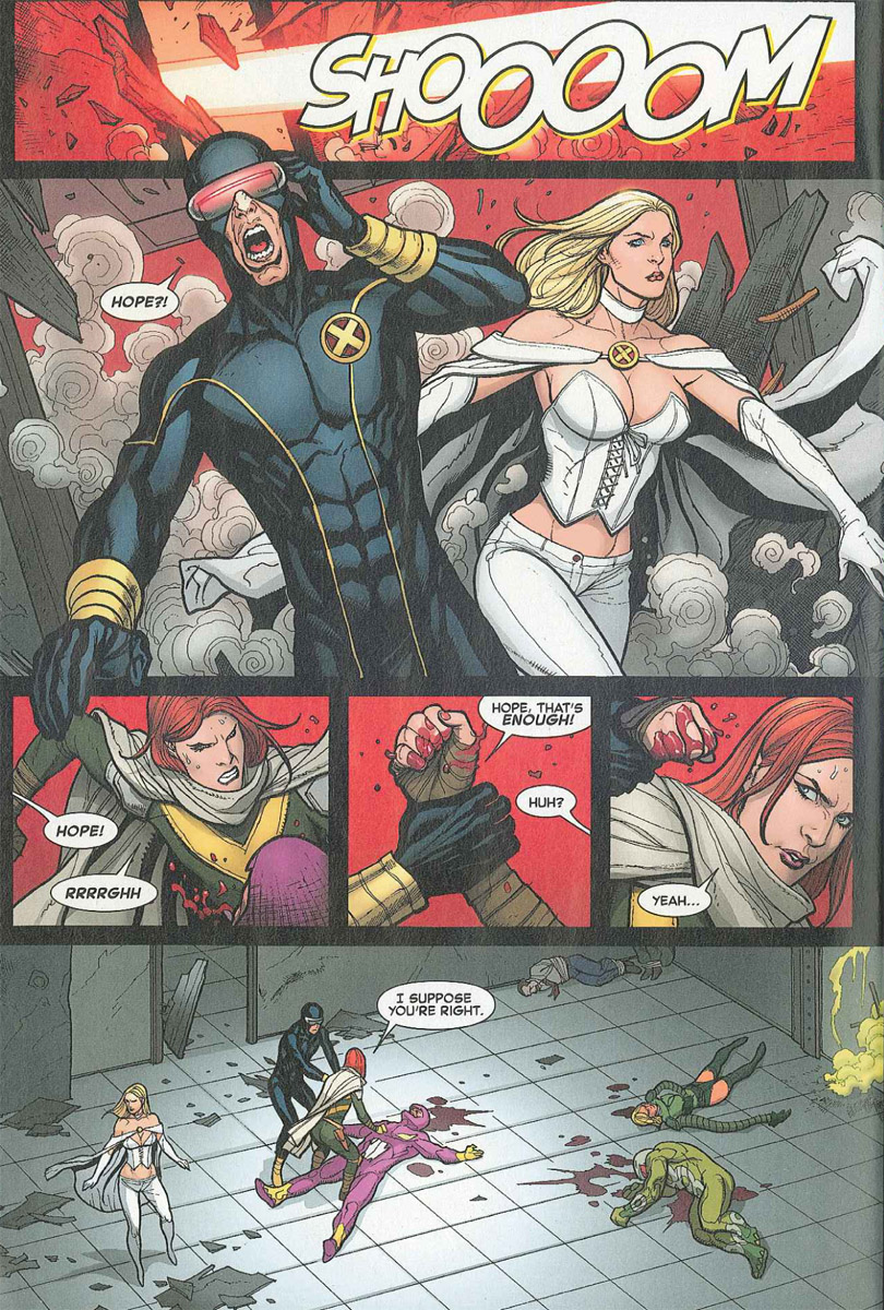 Hope arrives on the scene of a bank robbery; members of the Serpent Society are breaking into the vault. Hope takes down the snake-themed scoundrels by borrowing their powers and delivering vicious head butts. Cyclops and Emma show up to stop Hope from brutally beating Cottonmouth. Hope leaves, telling Cyclops that she is ready for the Phoenix. Back on Utopia, Hope is washing blood from her hands. She looks up at the sky, where far off, the Phoenix Force approaches Earth.