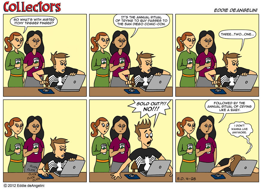 View articlesEddie deAngelini is a long time comic book fan and collector. He is the writer and artist of the internet comic strip Collectors, which is loosely based on his own life, marriage and comic collecting obsession. His love of comics began at a young age and his claim to fame is owning every issue of Amazing Spider-Man. He currently lives in Los Angeles with his wife Kristen, where they plan together for the inevitable zombie apocalypse.