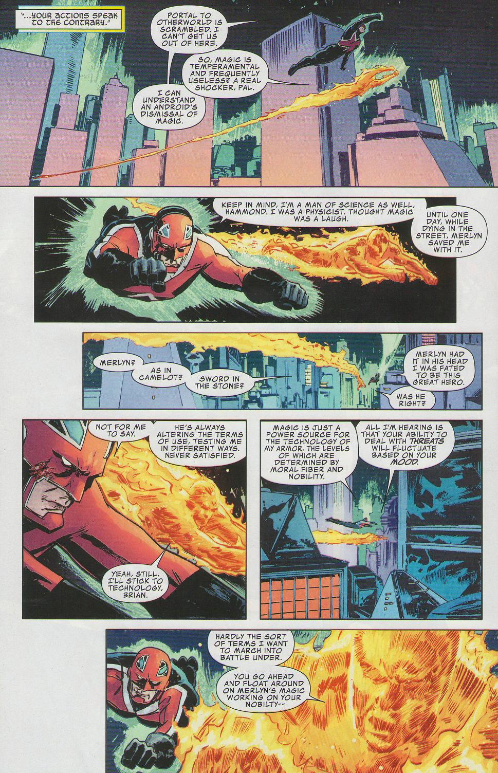 Captain Britain is attacked by Lady Deathstrike and Ultravisions (Vision clones). He defends against Deathstrike but is overwhelmed by the robots. When Jim Hammond appears to rescue him, the Ultravisions bow to him and call him Grandfather. As they fly off, Hammond learns the nature of Captain Britain’s powers (magic) and scoffs at them.