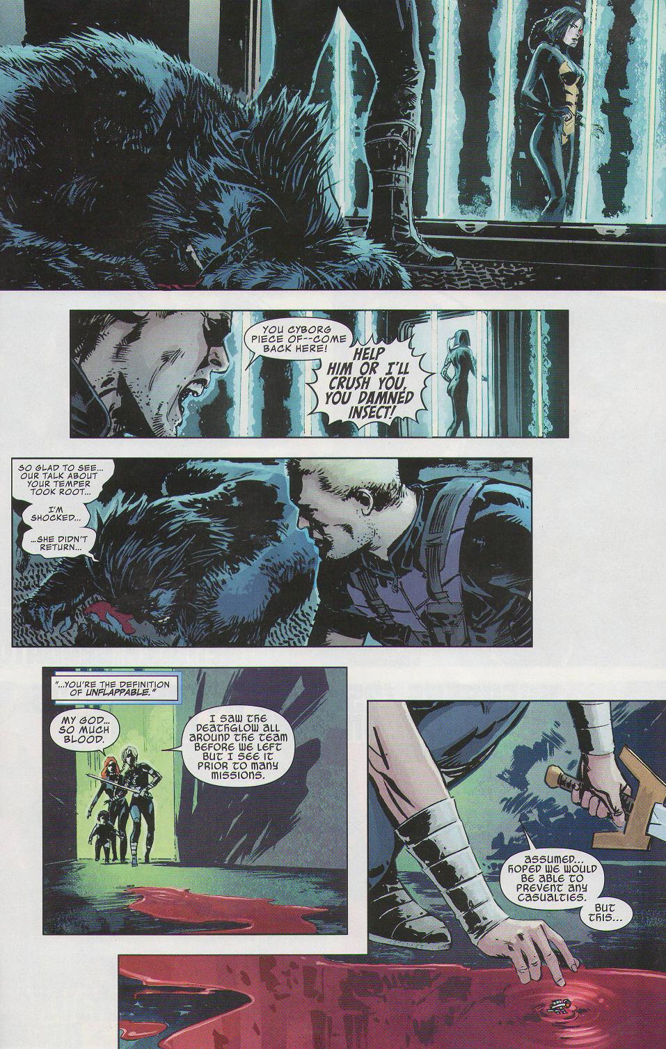 Hawkeye is the only character here that gets an inner monologue. Worth mentioning is his internal struggle trying to determine if Janet is the real deal or a copy, and then trying to keep Beast (whose arrogance finally catches up to him) from dying. It hasn’t been made clear whether this is the real Janet turned cyborg or a fake (I’m leaning toward the latter), so one can see why Hawkeye couldn’t bring himself to kill her, especially given their past romantic relationship.