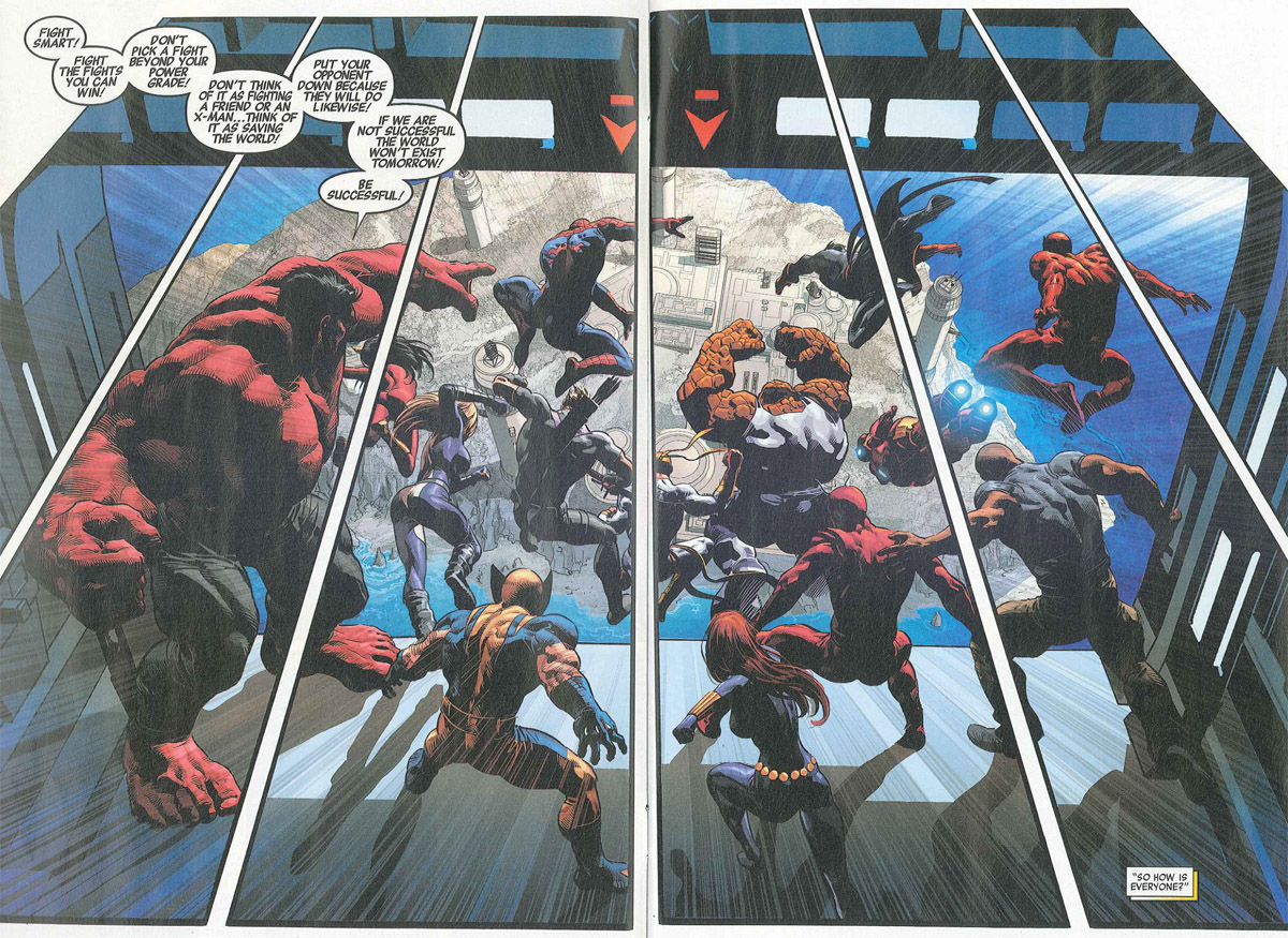 In the skies above the mutant island home of Utopia, the Avengers are gathered aboard the Helicarrier. Spider-Man and Mockingbird talk about the events of Spider-Island, and Black Widow, Iron Man, and Thor observe the interaction between Captain America and Cyclops. Wolverine expresses doubt that the two will come to an agreement before Cyclops unleashes an optic blast at Captain America, proving Wolverine right. Red Hulk shouts out orders when Captain America calls for the Avengers. The team jumps out of the Helicarrier led by Luke Cage, who drops down on the leader of the X-Men.