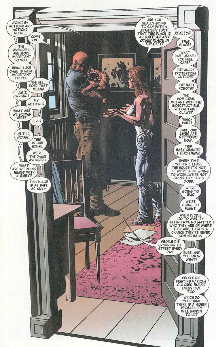 Jessica begins their conversation by apologizing to her husband for leaving with the baby. Jessica tells Luke that Avengers Mansion is not a safe place to raise a child. Luke is offended and taken aback when Jessica claims that being an Avenger is all he cares about. The private conversation is broken up when Iron Fist arrives to report that Captain America is gathering all the Avengers downstairs.