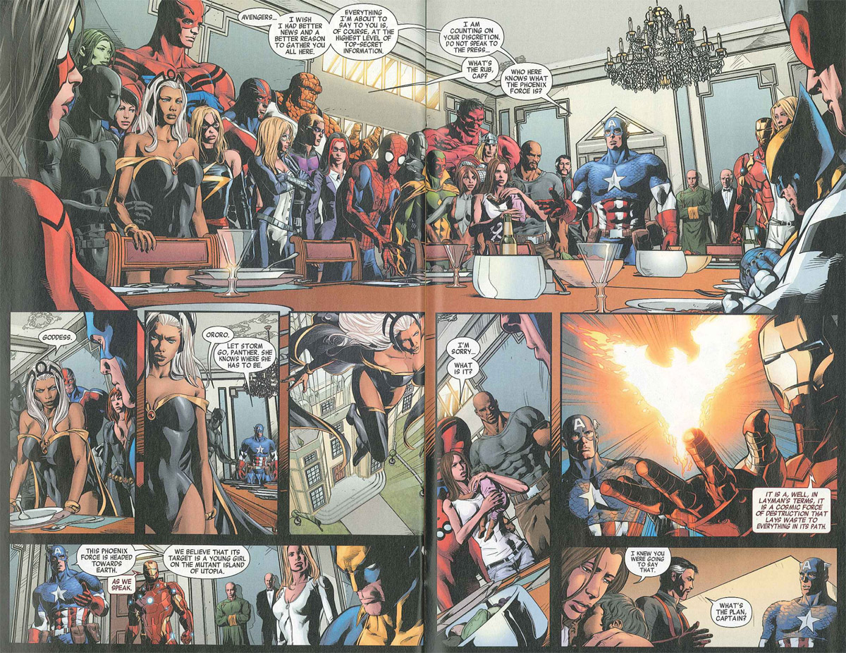 Several members of the various Avengers teams are gathered around the very same dining room table. Captain America asks for the heroes’ discretion before asking if anybody knows about the Phoenix Force. Storm utters “Goddess” and immediately leaves. Captain America accepts her decision and allows her to go. Iron Man and Captain America go on to explain the cosmic force to the remaining Avengers using intelligence they’ve acquired from the New Avengers’ own mutant, Wolverine.