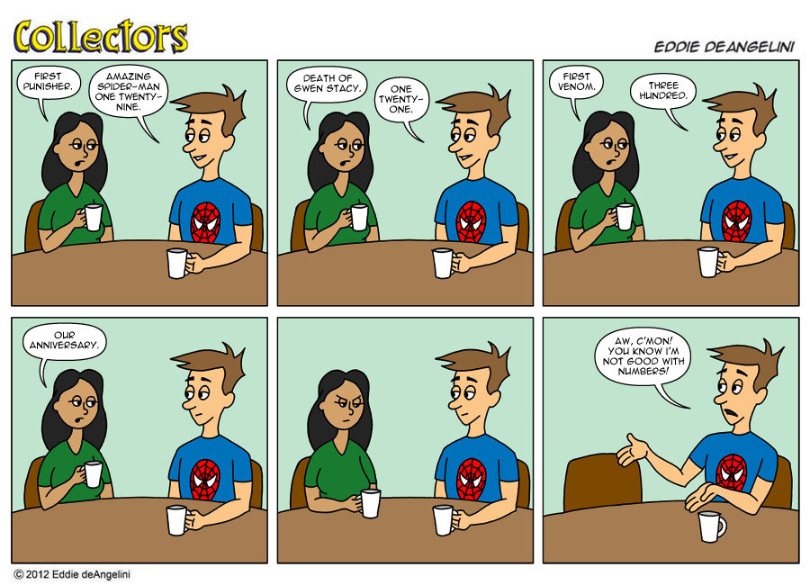 View articlesEddie deAngelini is a long time comic book fan and collector. He is the writer and artist of the internet comic strip Collectors, which is loosely based on his own life, marriage and comic collecting obsession. His love of comics began at a young age and his claim to fame is owning every issue of Amazing Spider-Man. He currently lives in Los Angeles with his wife Kristen, where they plan together for the inevitable zombie apocalypse.