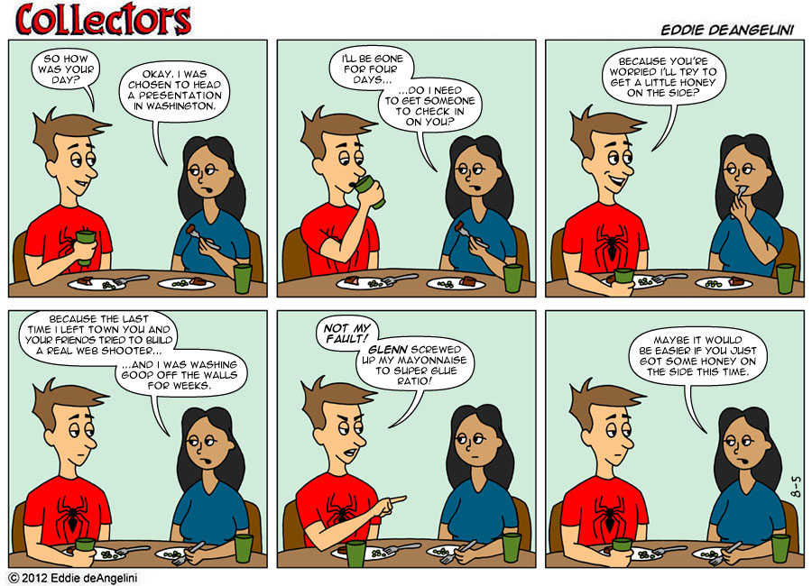 View articlesEddie deAngelini is a long time comic book fan and collector. He is the writer and artist of the internet comic strip Collectors, which is loosely based on his own life, marriage and comic collecting obsession. His love of comics began at a young age and his claim to fame is owning every issue of Amazing Spider-Man. He currently lives in Los Angeles with his wife Kristen, where they plan together for the inevitable zombie apocalypse.