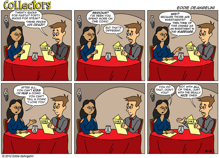 View articlesEddie deAngelini is a long time comic book fan and collector. He is the writer and artist of the internet comic strip Collectors, which is loosely based on his own life, marriage and comic collecting obsession. His love of comics began at a young age and his claim to fame is owning every issue of Amazing Spider-Man. He currently lives in Los Angeles with his wife Kristen, where they plan together for the inevitable zombie apocalypse.