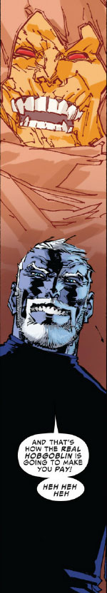 Any writer would probably have a hard time resisting the temptation to start up another “who is the goblin?” mystery when approaching this story. Kudos to Slott and Gage for not retreading that old ground. We know Phil Urich is the current Hobgoblin, a sans-glider version who wields a goofy fire sword for reasons I’ve never quite understood, but thankfully has kept it sheathed at least for this issue. And we know Roderick Kingsley is the original, who seems firmly poised in this issue to take back his title.