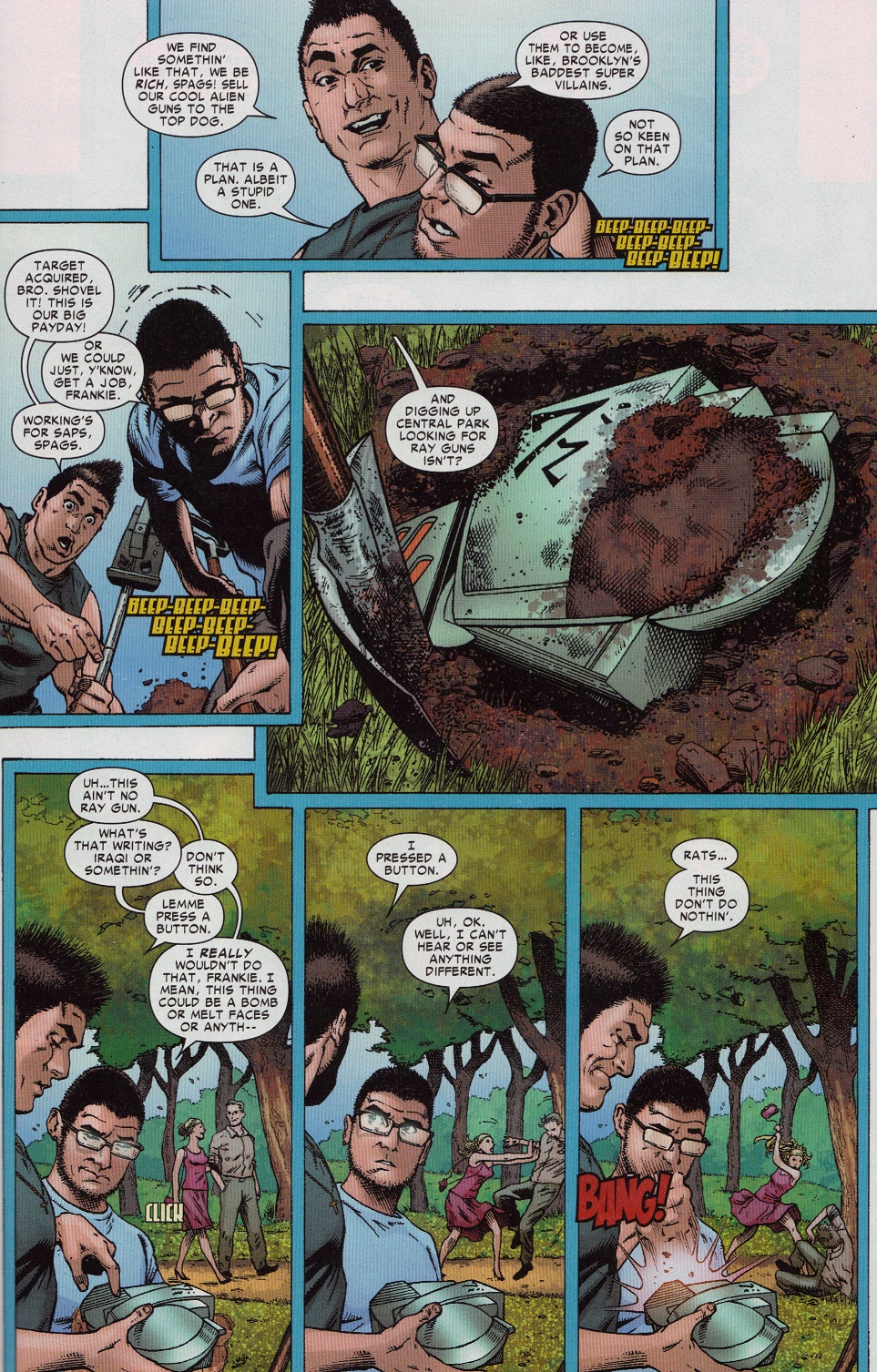 Two losers, Frankie and Spags, are using a metal detector in Central Park in hopes of finding “valuable junk” left behind during superhero fights when they stumble upon a device of unknown origin which produces an aggression-enhancing energy field (in other words, it makes people start attacking each other for no reason).  On their way to exchange it for cash with a local thug, Frankie and Spags get Spidey’s attention, but as our hero pursues them, he gets in an altercation with an angry Thing, who wants Spidey to pay up money owed from a poker game.