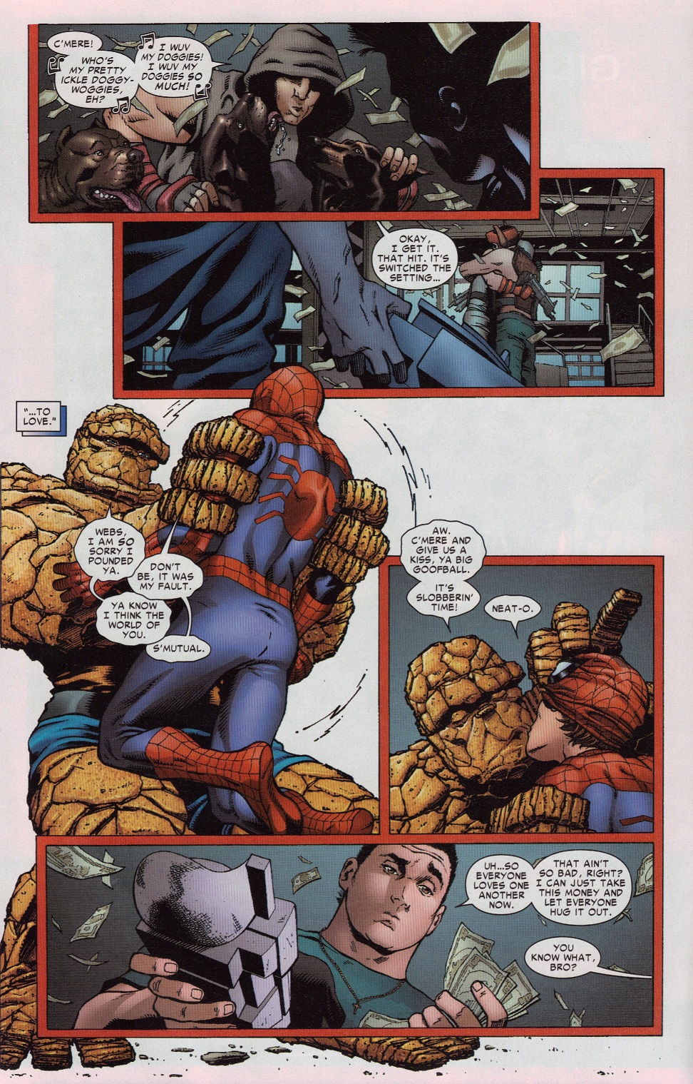 In the ensuing melee, Frankie reverses the energy field so that everybody loves each other instead.  He realizes the error of his ways and has the Thing smash the device.  With everything back to normal, the Thing takes care of the criminals while Spidey webs up Frankie and Spags.  Then Spidey webs away, with a newfound appreciation for New Yorkers.