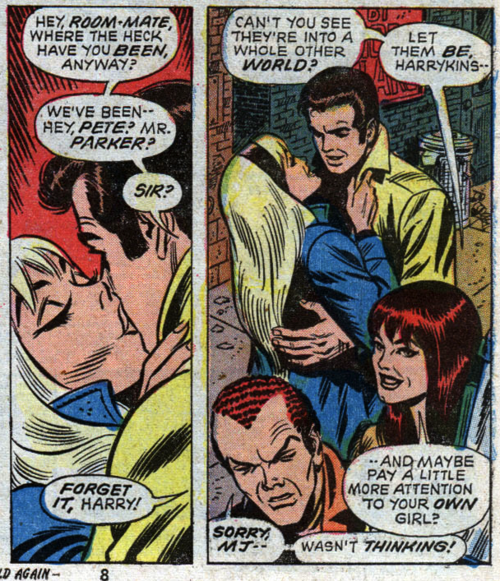 In these two panels from the classic Gerry Conway run of Amazing Spider-Man, that status quo is captured with Peter and Gwen in each other’s arms while Harry and Mary Jane aren’t shown to be as sweet.