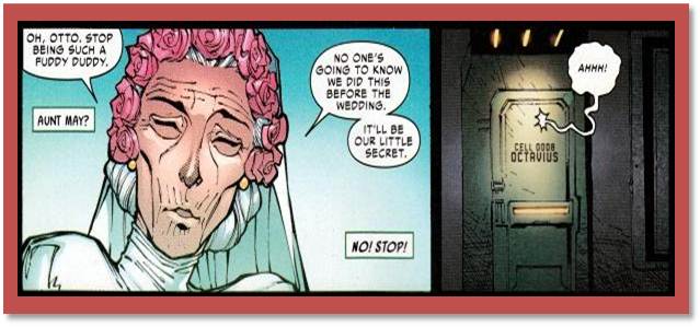 8. if anything this panel is the most mature “idea” that has even been address in the past year I’ve been reading Slott’s Spidey book. We have to remember that in real world terms (taking off the kid gloves) Doc Ock is a sociopath and the panel has no reference to Aunt May the woman only Ock’s imagined sexual desires. We are in the mind of a deranged human that has sexual desires like most humans (some of them being perverse). To me this is the first time that the “T” rating on the front of the book has possibly been warranted by delving into the mind of a sociopath. The problem is Slott handles it as a lousy joke instead of a chance to drive forward the narative. If I have a complaint about how the panel was used its dependent on if this is the first time Pete has knowledge that Ock has a thing for his aunt b/c if so then that should have been used to help further his fears about what Ock might do to Pete’s family.