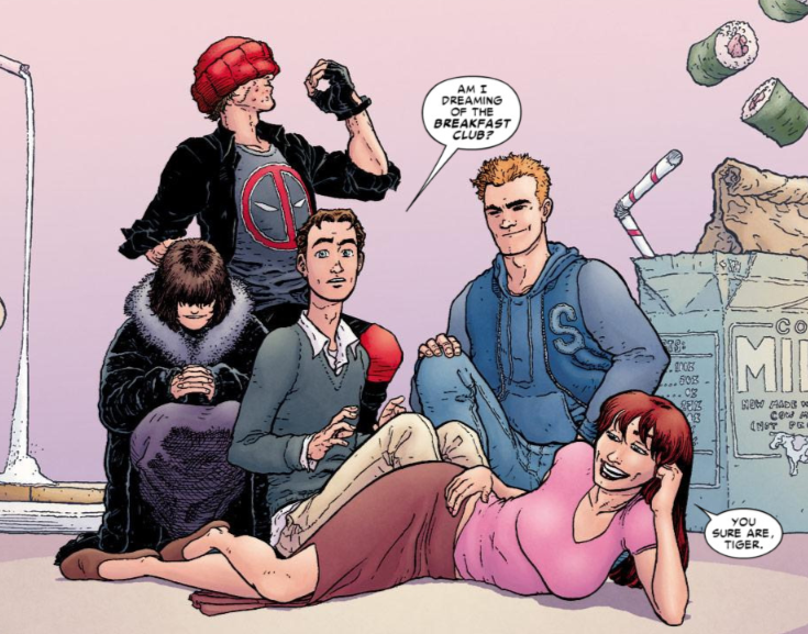 Peter is supposed to be “The Brain”, MJ is “The Princess”, Wade Wilson is “The Criminal” and not sure whether Flash is supposed to be “The Jock” or is it just Emilio Estevez’s character from the film, like Ally Sheedy’s “Basketcase”.