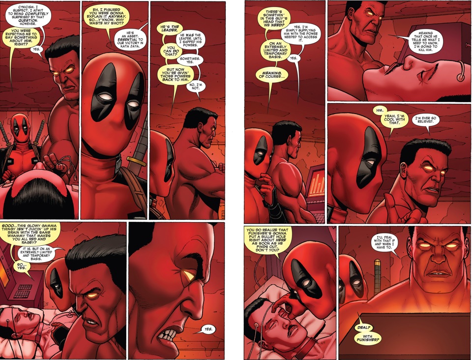 Colors: Artistically, the coloring is probably my biggest complaint about this series. Over on Hawkeye, Matt Hollingsworth is masterfully weaving purple into so much of Clint Barton’s world. There is no such subtly found here in making the tone of this book red and it’s down right annoying at times. 2/3s of the page have a red hue and often they don’t even make sense (we’re in the Leader’s past where it seems Red is now a favorite color of his, not… I dunno, Green?) or are for some stupid reason like, “It’s a red storage container.” Just, no class in the handling of the coloring at all. Also, the book is largely a dull palate of colors, though every now then it would get more vibrant, especially when Deadpool was on page.
