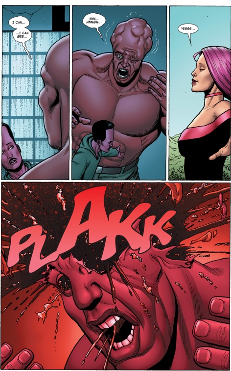 That being said, the new designs for these characters are pretty awful. The armor on both Frank and Venom look stiff at all times on the interior of these comics and Venom’s tendrils look laughably weak. The justification for Frank’s new armor is Gamma protection (through wearing Gamma radiation on his chest, what?) and Venom does it just so he fits the red/black motif of everyone else. So yeah, not a fan of these costumes. Oh and the Leader is Red now for no damn reason.