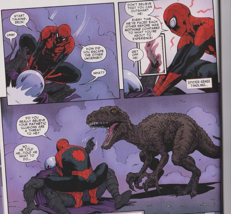 Speaking of Punisher they have him reference what Octo-Spidey did to Massacre and Jester as going too far. I don’t read much Punisher but the last time I saw him in a book was Civil War when he was shooting Jester in the head, so I don’t see it likely that he cares a whit about what Spidey is doing to the Jester.