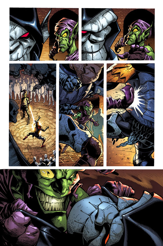 8. Whoever that guy in the gray is (Gabriel Stacy in a new Gray Goblin costume?! Roderick Kingsley?!) is clearly challenging the Green Goblin’s authority and leadership, and probably says something along the lines of, “How do we know you’re even the real Green Goblin? You could be anybody under that mask. If you’re really Norman Osborn, let’s see you prove it or step aside.”