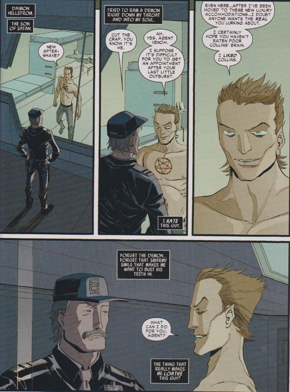 Flash goes to a Virginia prison to check on Damien Hellstrom, who is indeed still imprisoned there from some earlier story. Hellstrom doesn’t reveal anything about his dead double but he does warn Flash that some kind of Hell-war called “The Descent” is on the verge of occurring. Flash wonders if the mark of Mephisto he bears from issue 23 is going to pull him in, only for Hellstrom to reveal the mark of Mephisto has been removed from Flash somehow.