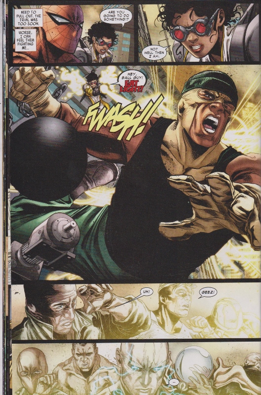Sun Girl is injured so Ock takes her as well as Liz Allen’s MacGuffin that the Wrecking Crew wanted to steal back to his undersea lab now dubbed “Spider Island.” The Six are back in their cells vowing revenge on Octo-Spidey (except for fake-Mysterio who just wants to go home). Also apparently the Russian assassin from the Chameleon story in Avenging is now dead. Sun Girl wakes up and attempts to escape but Ock stops her.