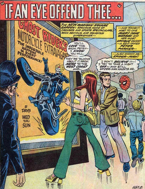 This is a scene from Marvel Team Up # 15. As I kid I thought it was odd that Spidey had a giant head floating here. Gotta love Mary Jane’s platforms.