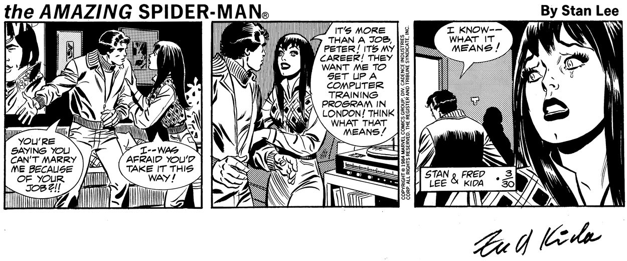 During the 1980’s Fred Kida drew Spider-Man five days a week in newspapers across the country. He replaced John Romita senior on the Spider-Man strip and he did a hell of a job. He was the first artist I saw when I first started reading the strip. Fred passed away Wednesday April 3rd and was 93 years old. Kida was already well known in the golden age of comics penciling Airboy in the 1940s. He worked on comics and strips until 1987. Thanks to Mark Evanier’s blog for the heads up. Also here is his obit.  Check out one of the images of Peter getting rejected by Mary Jane when he proposes to her. I’d forgotten that happened. I hope Marvel continues to release the newspaper strips in trade form.