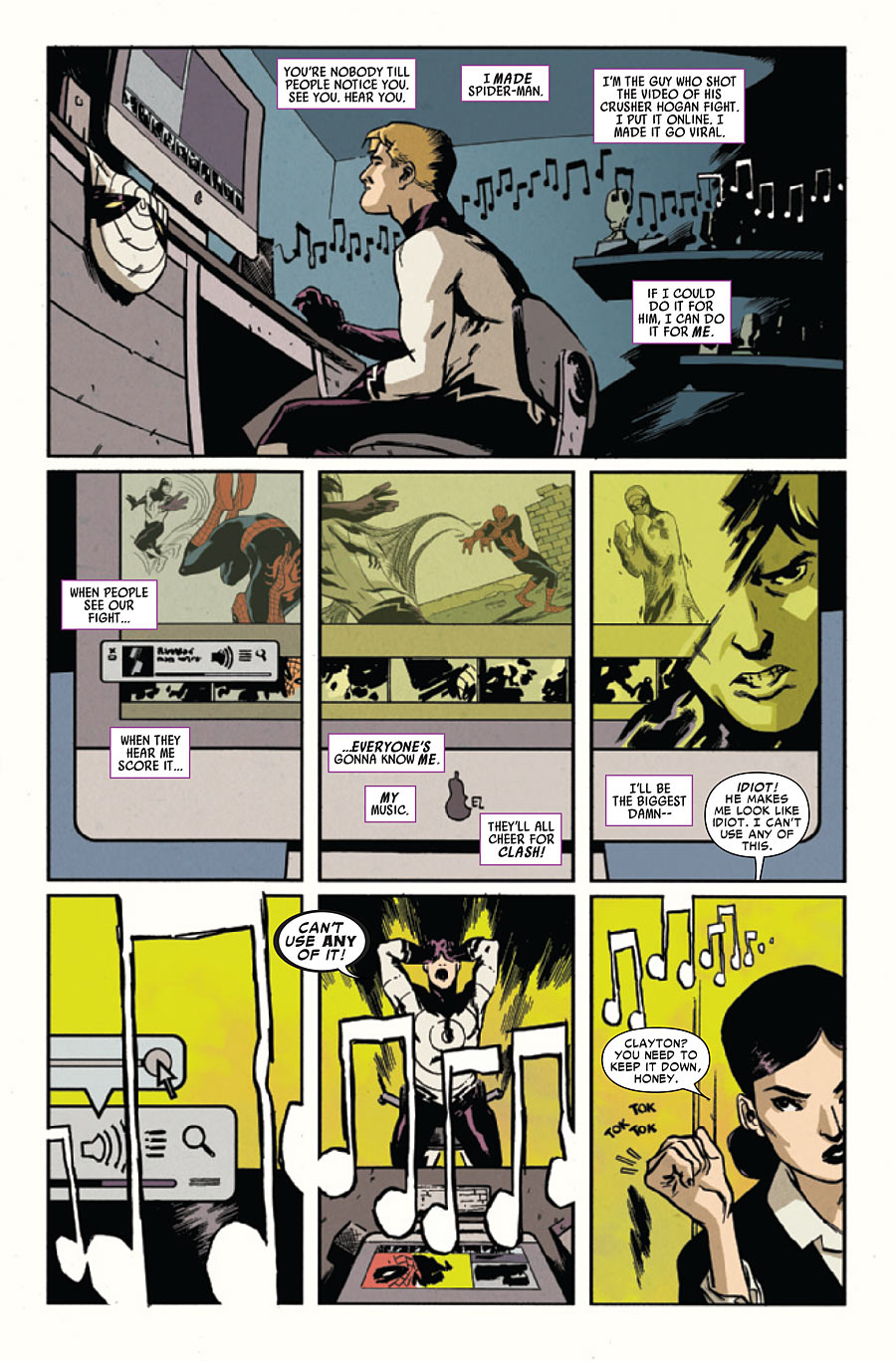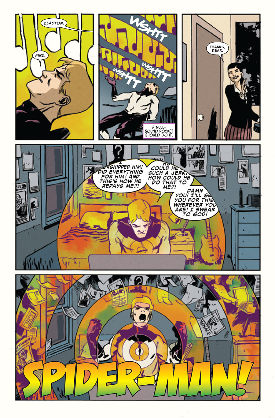 PLOT: The story begins with Clash attempting to edit together the fight footage he captured while battle Spider-Man last issue. Unfortunately he doesn’t have any good footage, and curses Spider-Man. From here we cut back to Forrest Hills where Aunt May has discovered the truth about Peter’s ongoing whereabouts, he is…a DRUG DEALER! Peter of course claims he isn’t stating he is merely getting things ready for the science fair and a neighbor had brought along the money anonymously. Meanwhile at the science fair Clayton Cole (Clash) is moping around using his sound powers to make crazy music. That is until Polly Mckenna (AV Club member from last issue) starts up a conversation with him. They hit it off pretty well, and Clayton is hoping to wow her at the science fair on Saturday.