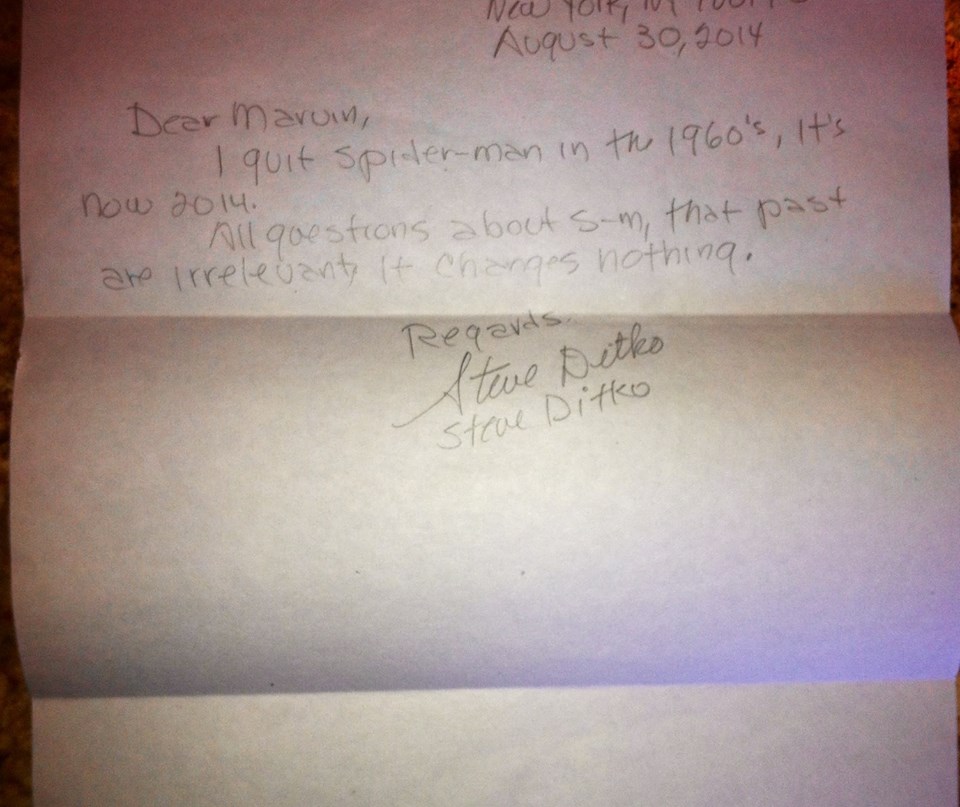 Spider-Man Co-Creator Steve Ditko recently wrote back to Spider-Fan Marvin Hoover. Hoover wanted to get Ditko’s opinion about Marvel “stealing Spider-Man from him over the years.” Ditko wrote him back last month with this hand written note. He recently posted the letter in the Ditko Facebook Fan page.