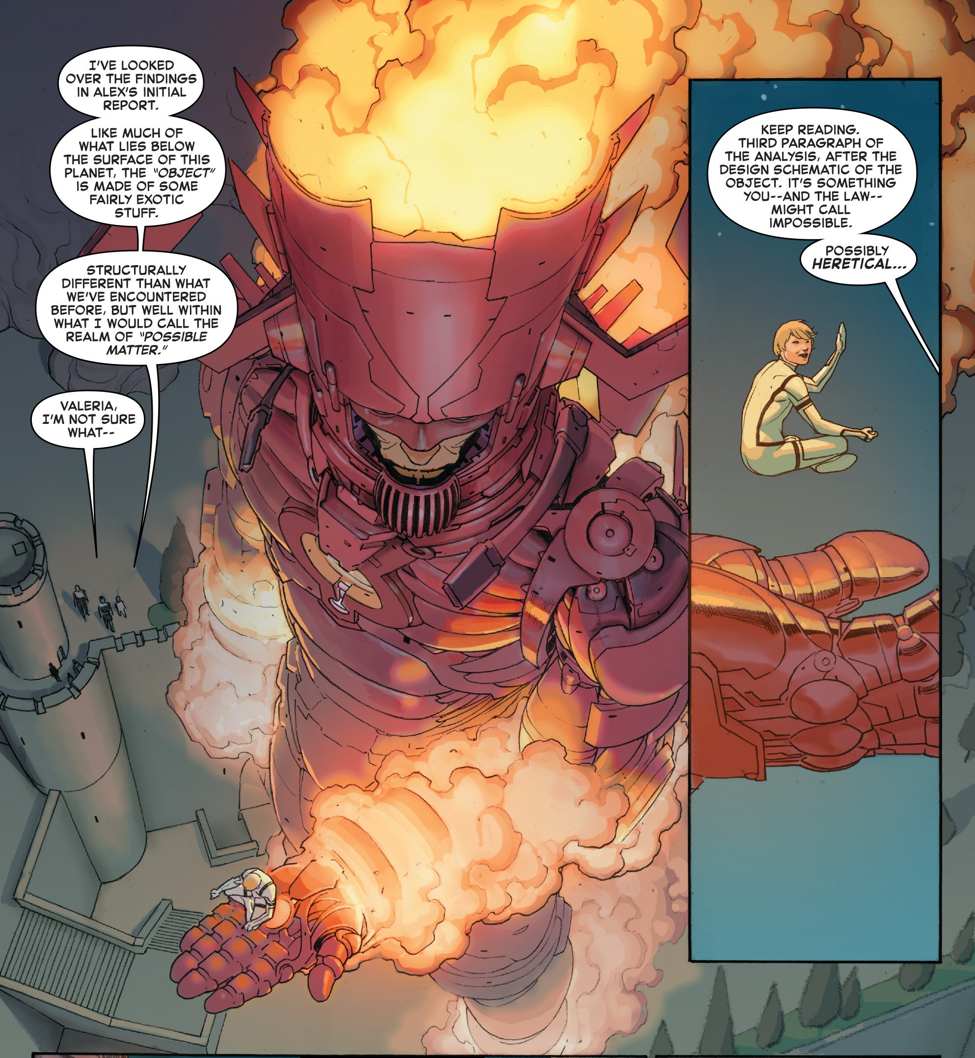 Through the conversation between the newly appointed Thor and the elder Thor, we learn Doom created the heavens and the Earth, and divided the world into kingdoms. Each kingdom is overseen by an appointed baron from a noble house, and travel between kingdoms is discouraged unless one has permission. The Thors police the kingdoms, enforcing and dispensing Doom’s divine law and order from atop their floating citadel in Doomgard. Meanwhile, we see how in one of those kingdoms called Utopolis, Future Foundation Ministers Alex Power, Dragon Man and Bentley-23 arrive at the site of a supposed earthquake, where Moloid geologists have uncovered something which had long since been buried. The Foundation tell the Moloids the earthquake was caused an escaped Hulk, and the object which is uncovered is the rusted and derelict Life Raft from Secret Wars (2015) #1.