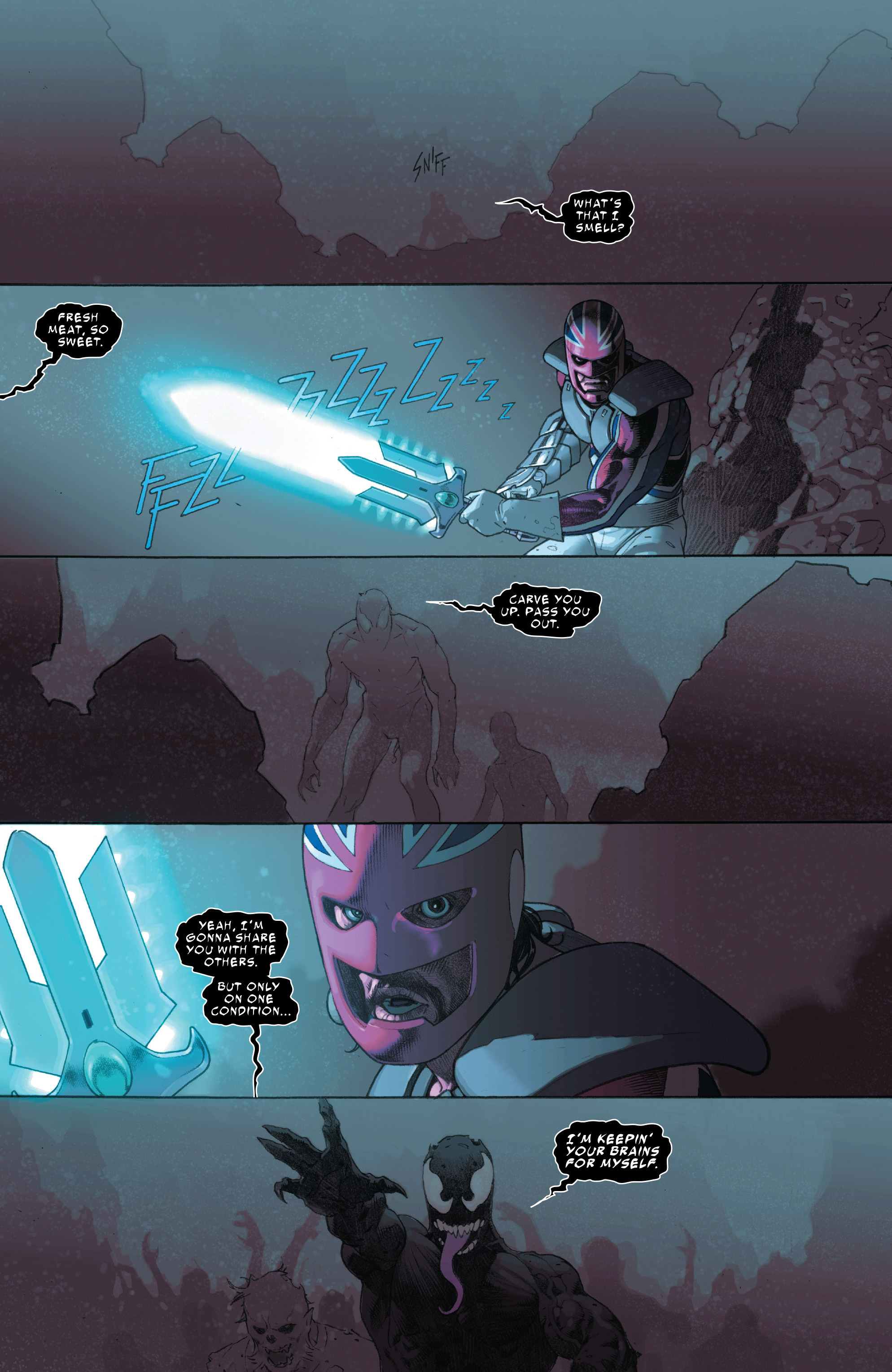 Yet world-building isn’t all this comic has to offer. Thanks to Esad Ribic’s art, there are scores of terrific scenes and jaw-dropping visuals throughout. Describing such imagery as the hall in Doomgard, Mr. Sinister’s ruby-quartz palace, the desert of Utopolis, and Doom’s castle which has a gigantic tree several miles high guarded by a burning Galactus just wouldn’t to them justice. The trial at Doom’s court is a treat for anyone who is a fan of Marvel’s various What If? tales and alternate universe stories. The moment where Jamie Braddock leaps down from the Shield and then faces and cuts through swathes of the Marvel Zombie with what amounts to a giant lightsaber hearkens back to Ribic’s work on Jason Aaron’s Thor: God of Thunder. Unfortunately, no matter how gorgeous his illustrations are, Ribic inexplicably appears to have serious problems drawing facial expressions. Given how many times he shows people slack-jawed and googly-eyed, I’m starting to believe Ribic has just one image he has on file of someone’s face which he uses to express surprise, fear, shouting, confusion, happiness—whatever the script calls for—then traces or copies it onto the page. That and someone scowling or staring blankly ahead. It’s a sore and distracting spot on otherwise spotless work.