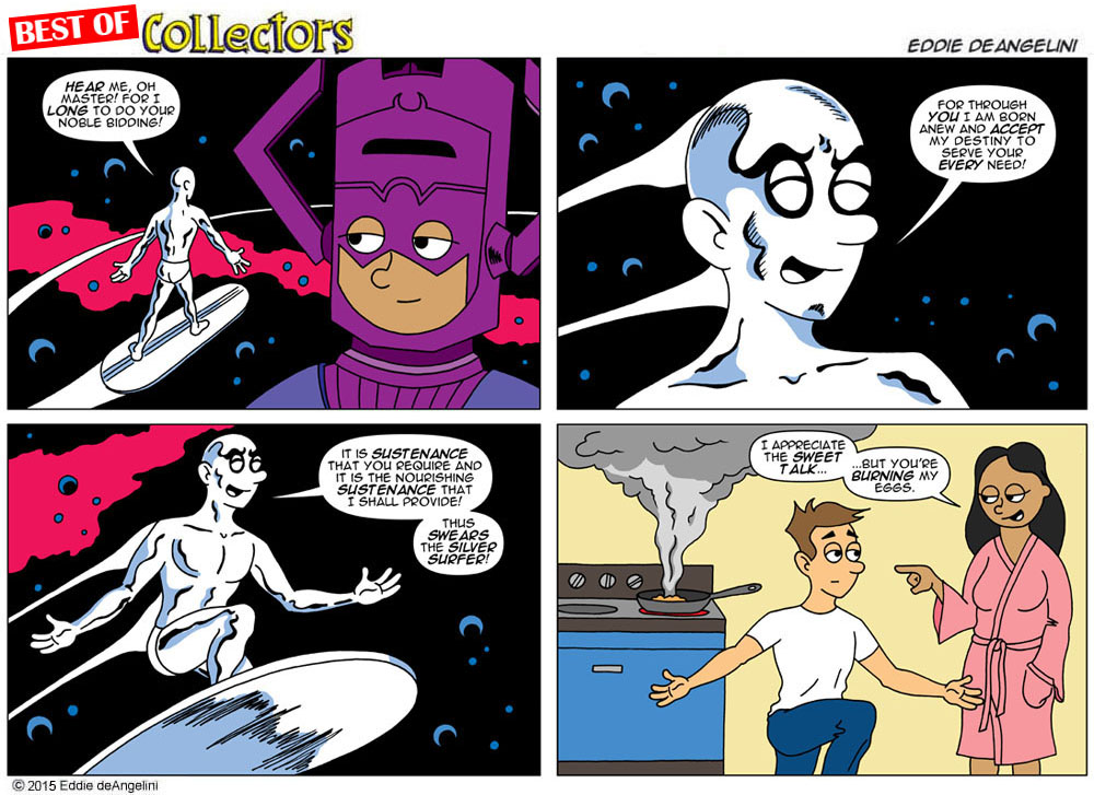 View articlesEddie deAngelini is a long time comic book fan and collector. He is the writer and artist of the internet comic strip Collectors, which is loosely based on his own life, marriage and comic collecting obsession. His love of comics began at a young age and his claim to fame is owning every issue of Amazing Spider-Man. He currently lives in Los Angeles with his wife Kristen, where they plan together for the inevitable zombie apocalypse.